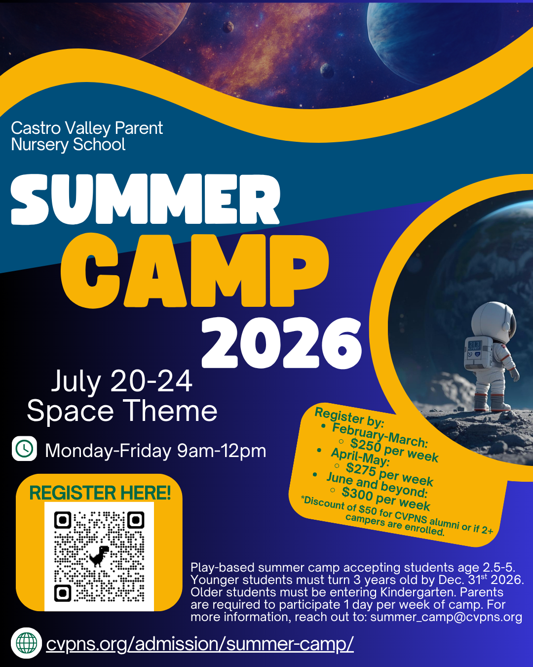 Each day features art, science, games, music and outdoor activities. Parents assist in leading camp activities on one of the five days for each week the child is enrolled in in camp. All snacks and activities will be provided by the school. Capacity of 25 students.
